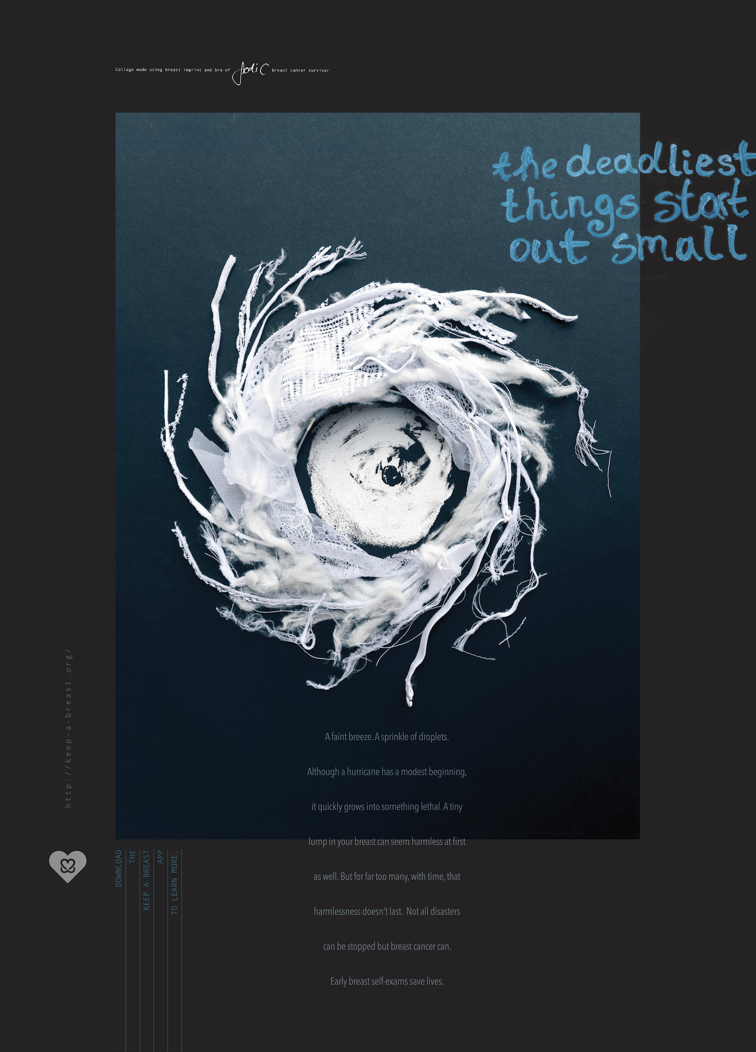 Copy: A faint breeze. A sprinkle of droplets. Although a hurricane has a modest beginning, it quickly grows into something lethal. A tiny lump in your breast can seem harmless at first as well. But for far too many, with time, that harmlessness doesn’t last. Not all disasters can be stopped but breast cancer can. Early breast self-exams save lives.