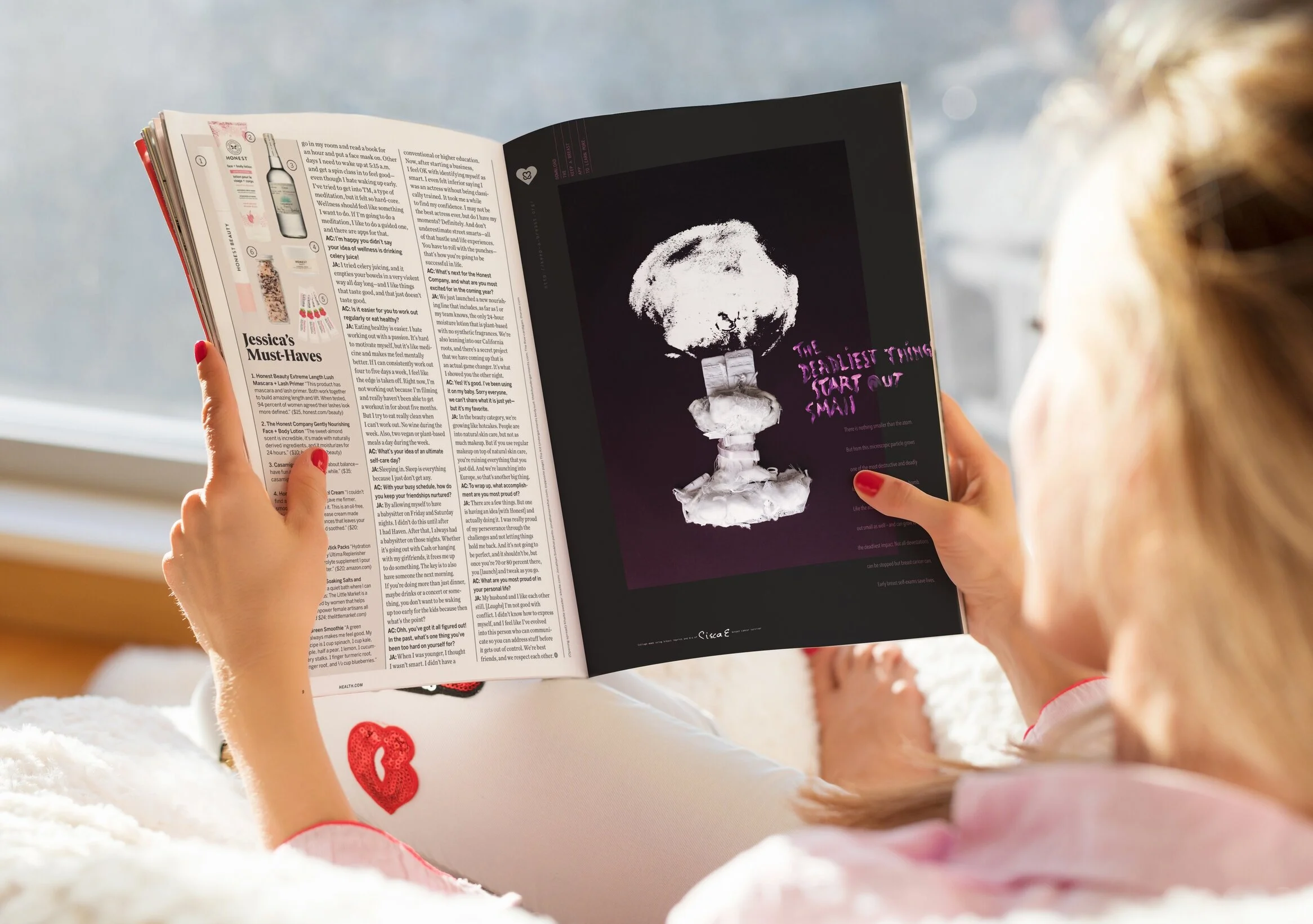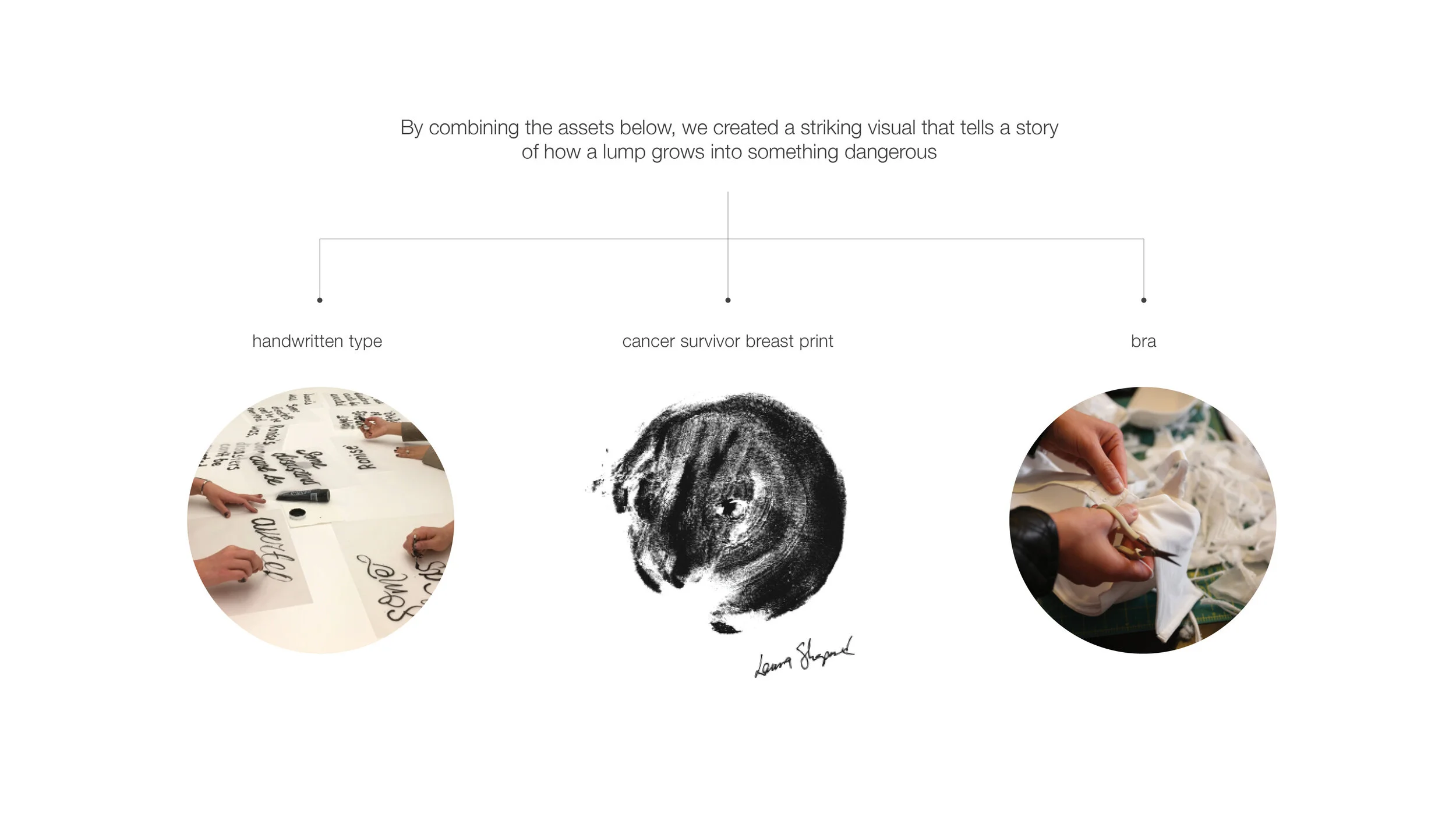 By combining handwritten type, breast prints from a cancer survivor, and a bra, we created a striking visual that tells a story of how a lump grows into something dangerous.