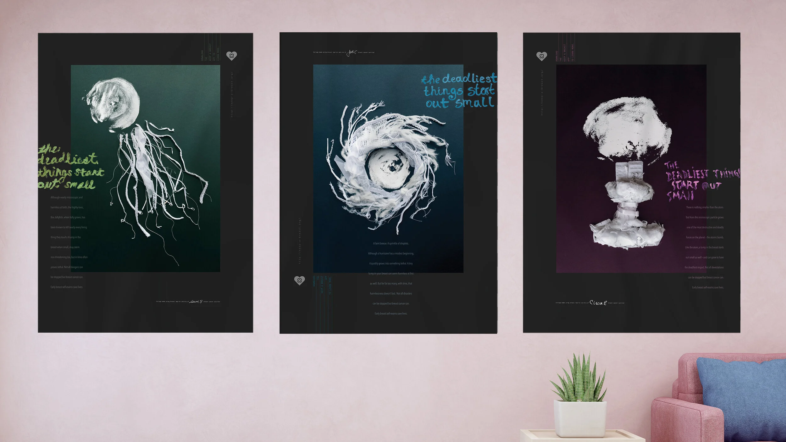 Copy: Although nearly microscopic and harmless at birth, the highly-toxic, Box Jellyfish, when fully grown, has been known to kill nearly every living thing they touch. A lump in the breast when small, may seem non-threatening too, but in time often proves lethal. Not all dangers can be stopped but breast cancer can. Early breast self-exams save lives.